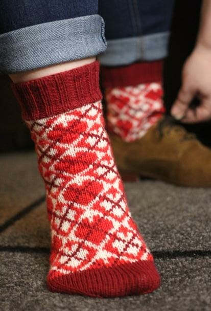 “I Heart Argyle Socks” are top down socks that begin with a 2×2 ribbed cuff and a stranded colorwork pattern that makes up the leg and foot of the sock. This design features a heart motif superimposed on an argyle background. Waste yarn is placed for an afterthought (peasant) heel. After finishing the sock, the third color that creates the crossed diamond motif is worked in duplicate stitching.