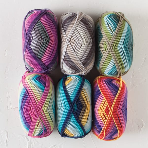 Your favorite self-striping yarn is back, this time in 6 brand-new colors of both sock and worsted weights! Felici is a superwash blend of 75% Merion and 25% Nylon. Explore both weights of Felici HERE >>