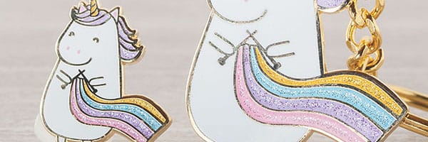 Absolutely brand new to Knit Picks, a select few of our new designs are available as key chains. They’re basically the same as our enamel pins, but bigger and with a ring to garnish your keys. Though I’ve never been one for key bling, my keys have been enjoying the company of one of the first Kitty Yarn Ball samples. After a good amount of time being jostled around in my pocket (and dropped on the ground and thrown across the parking lot. . .), it’s come out with only a few scuffs, looking as good as the day it arrived.