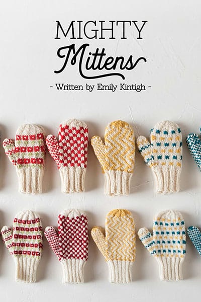 Mighty Mittens: This book includes template mitten patterns for both fingering and worsted weight yarns, along with 8 stranded stitch patterns that include instructions and charts for both weights. Sized for hand circumferences from 4″ baby mitts to 9-1/4″ for the largest man, you can choose your favorite yarn, color, and stitch for a custom project.