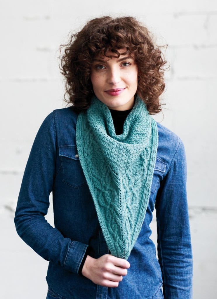 Shifting shades of Hawthorne Speckle make a big impact in this asymmetrical triangle scarf! The yarn is held double to create the color effect, which also makes it a quick knit.