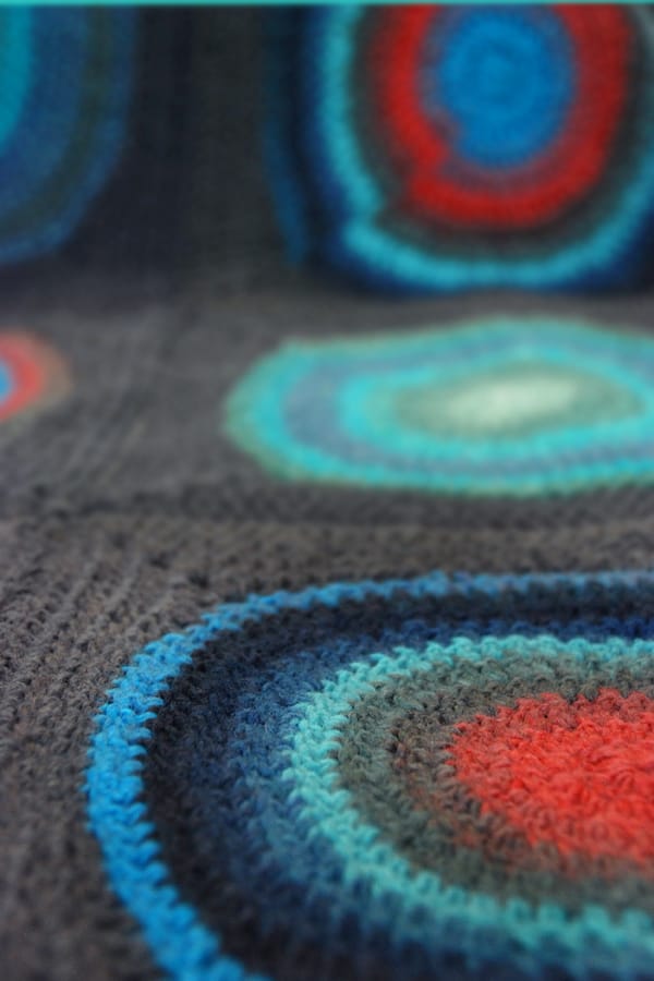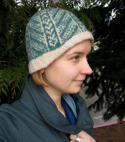 The lilies are worked in intarsia, and their simple shapes and coloring