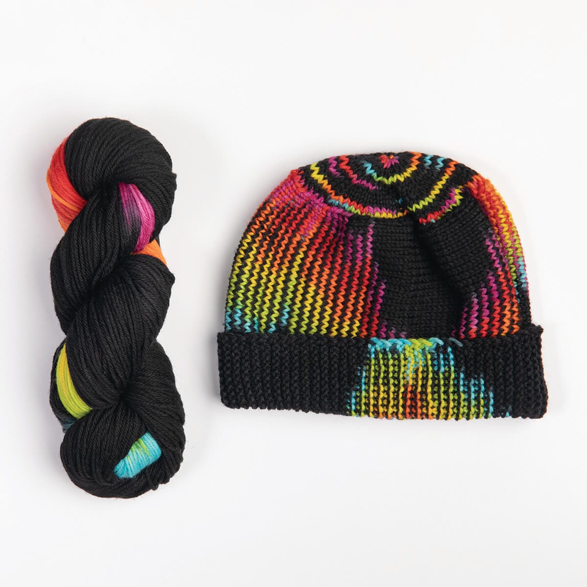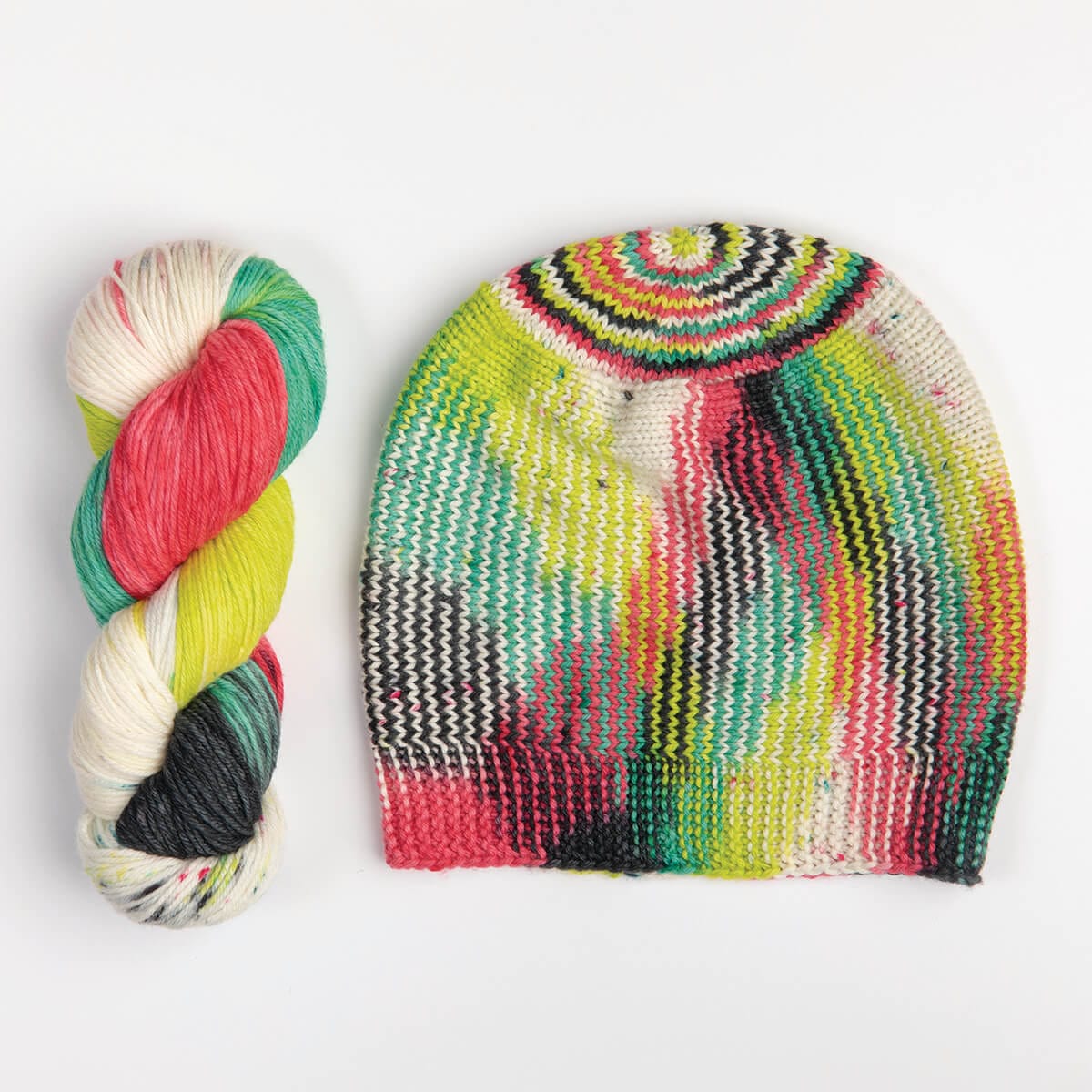 Make the most of Swish Pops’ many colors in this planned pooling hat! Planned pooling means working the yarn at a gauge and stitch count that causes the colors to line up with each other in an intentional-looking pattern. Depending on the colorway used and the exact gauge, this may be a wavy design, or it may resemble argyle or plaid, or it may be more of a color-block abstract painting kind of vibe. There’s no way to know what you’ll get until you start knitting!