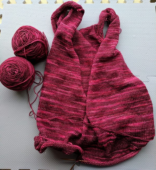 Stacey worked on her Napali Cardigan for a while…but then got distracted. She had a couple of skeins of Hawthorne Sport in Rose City in her stash and decided what she really wanted to do was make another Ms Marigold to wear this spring and summer! So that’s what she’s been working on – in her words, “Still a sweater like my resolution, just a different one.”